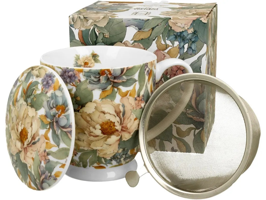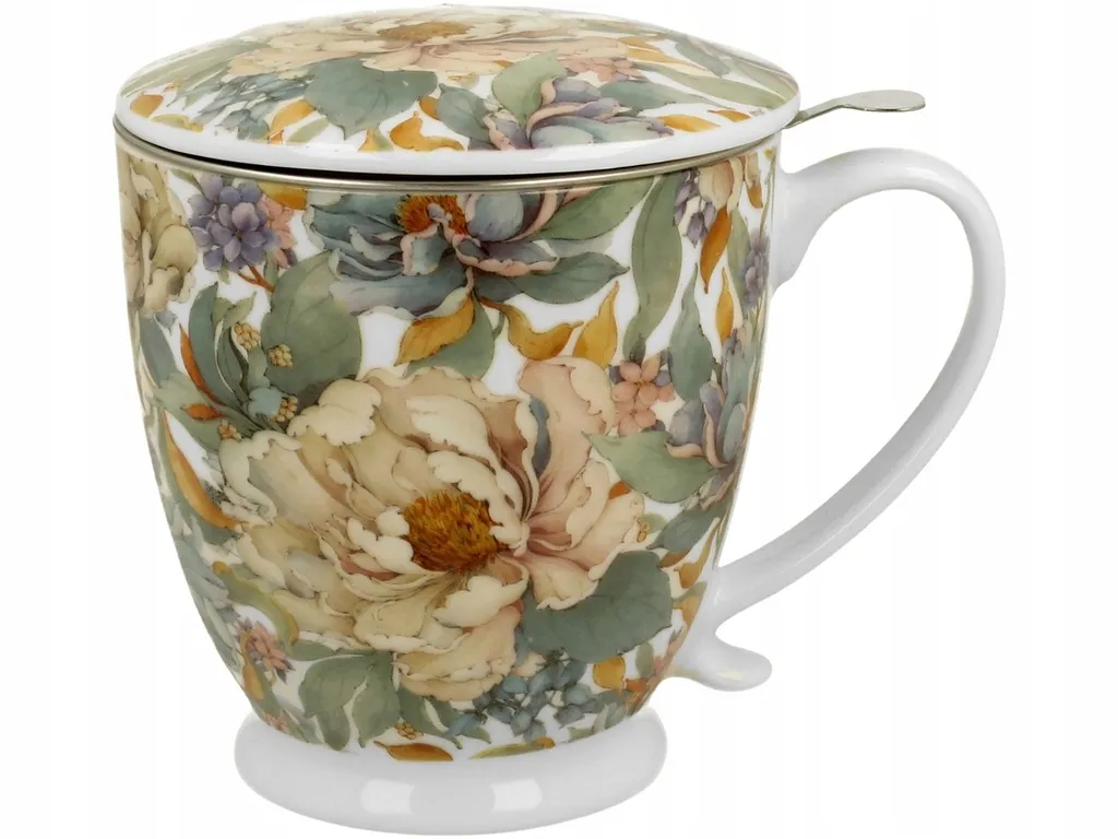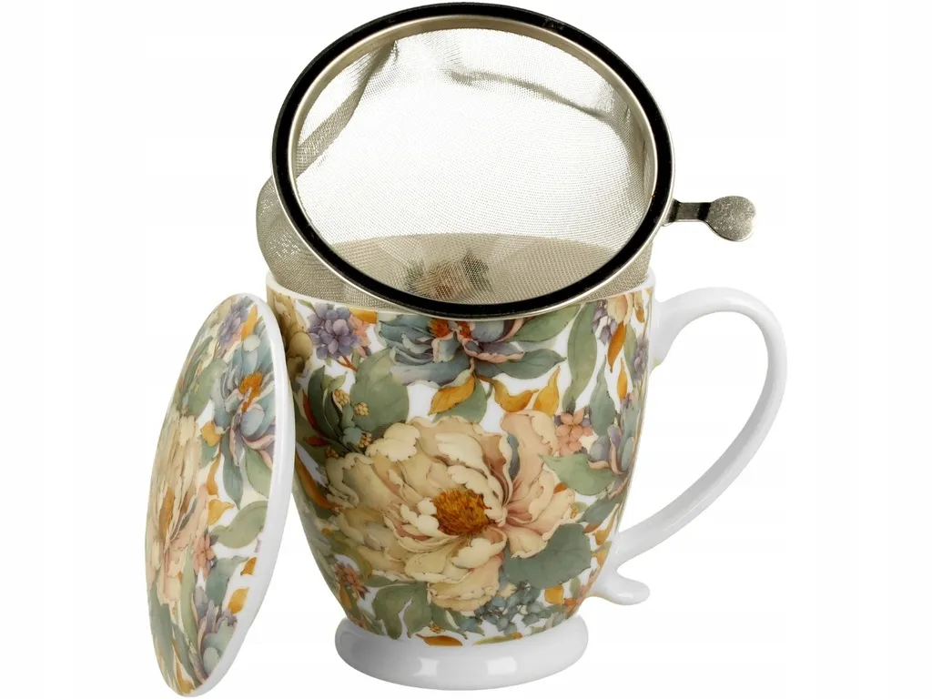Porcelana premium zapewnia nie tylko piękny wygląd, ale również wysoką trwałość. Dzięki temu kubek zachowuje elegancję nawet przy częstym użytkowaniu. Metalowy zaparzacz umożliwia przygotowanie klarownego, aromatycznego naparu, a dopasowana pokrywka pomaga dłużej utrzymać jego temperaturę — idealnie podczas pracy lub relaksu. Delikatny motyw piwonii dodaje całości subtelnego uroku i sprawia, że kubek świetnie wpisuje się zarówno w klasyczne, jak i nowoczesne wnętrza.