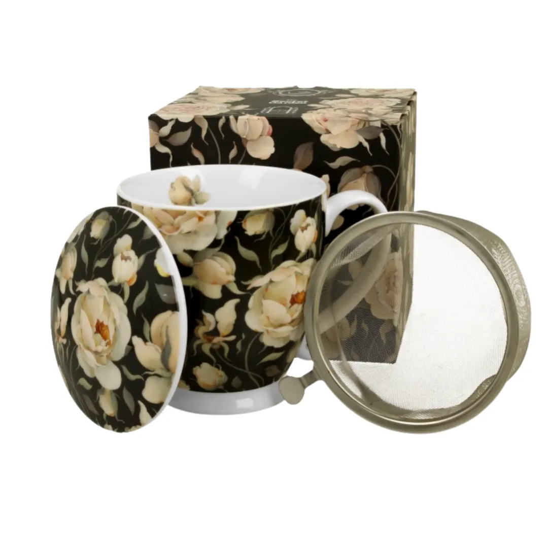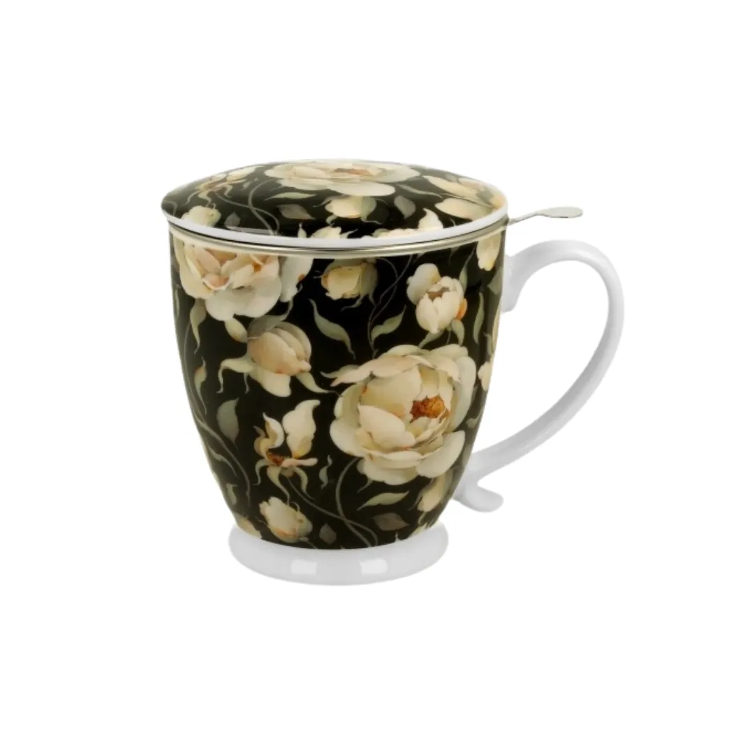 Kubek na stopce ENGLISH ROSES BLACK o pojemności 510 ml to kwintesencja elegancji połączona z funkcjonalnością. Wyrazisty motyw róż na głębokim, czarnym tle nadaje naczyniu luksusowy charakter, a dołączony zaparzacz sprawia, że przygotowanie ulubionego naparu staje się proste i stylowe. To idealny wybór dla osób ceniących wyrafinowany design oraz rytuał parzenia herbaty liściastej.