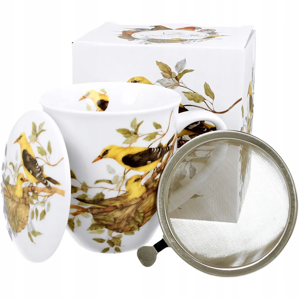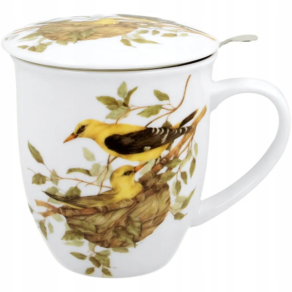 Kubek z kolekcji Ptasi Świat z motywem wilgi zwyczajnej — porcelana New Bone China o kremowo-białym odcieniu, ozdobiona subtelną grafiką ptaka i gniazda. Połączenie elegancji i natury w codziennym użytkowaniu.
