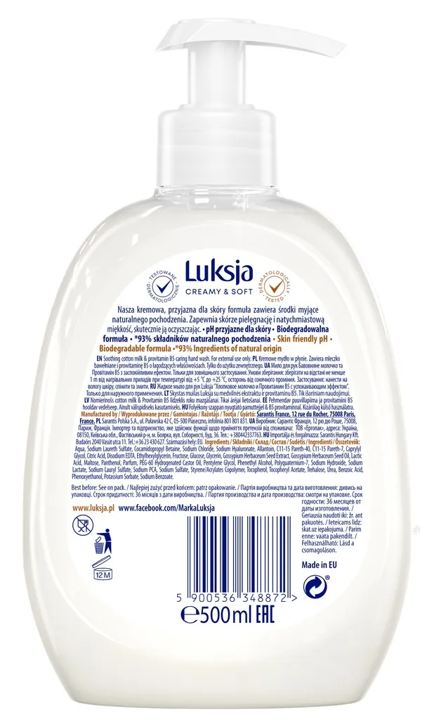 Luksja Creamy & Soft Cotton Milk to aksamitne mydło w płynie, które zamienia codzienną higienę rąk w prawdziwą chwilę przyjemności. Formuła wzbogacona proteinami mleka bawełnianego nie tylko skutecznie oczyszcza, ale przede wszystkim intensywnie pielęgnuje i nawilża skórę dłoni, pozostawiając ją jedwabiście gładką.