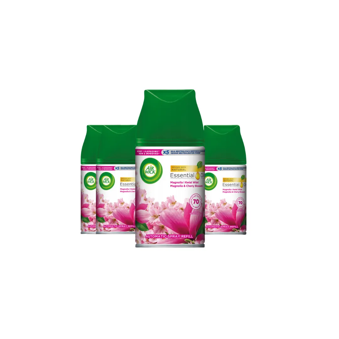 Wkład Air Wick 250 ml do odświeżacza automatycznego łączy elegancję magnolii z delikatnością kwiatu wiśni. Zapewnia długotrwałą, subtelną świeżość i przyjemną atmosferę w pomieszczeniu.