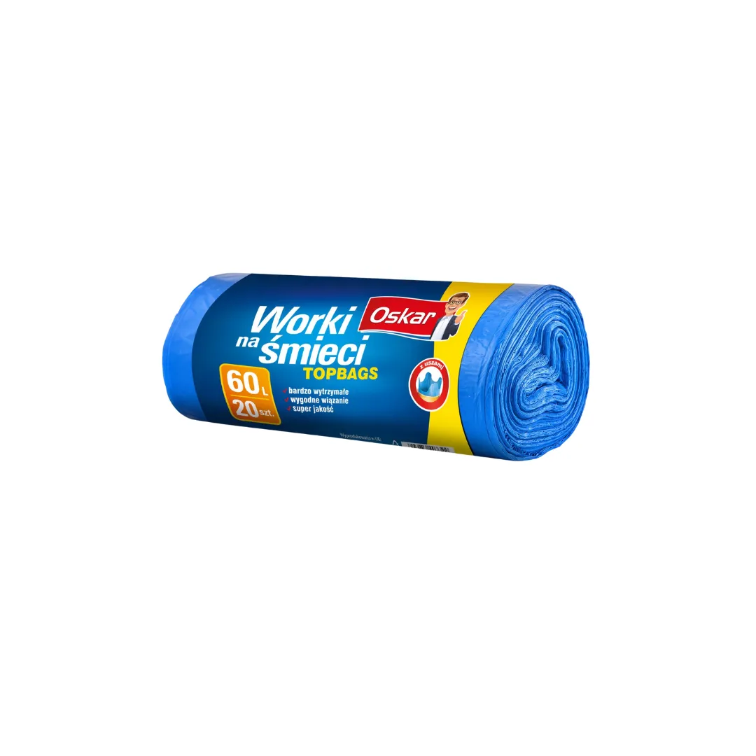 Worki na śmieci OSKAR Topbags z uszami to praktyczne i wygodne worki o pojemności 60 litrów, idealne do gromadzenia odpadów domowych. Wyposażone w **wygodne uszy**, ułatwiają wiązanie worka i jego przenoszenie bez ryzyka zabrudzenia rąk.